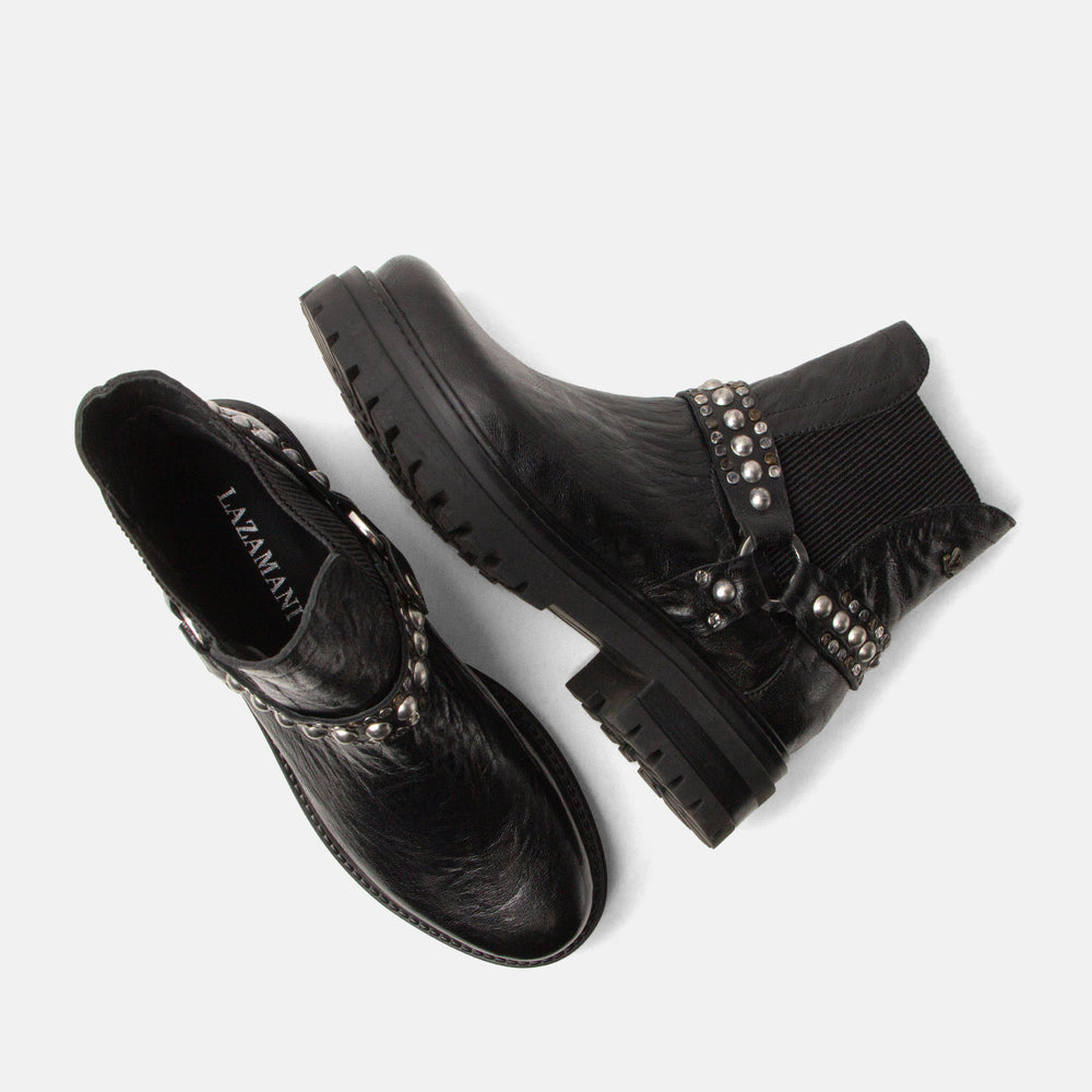 Setze auf Rock-Chic mit den Jagger Chelsea-Boots von Lazamani – sie machen jeden Look zu einem Statement. Das glänzende Glattleder in klassischem Schwarz verleiht ihnen eine luxuriöse Ausstrahlung, während der dekorative Riemen mit Nieten für einen edgy Twist sorgt. Dank der elastischen Seiteneinsätze schlüpfst du mühelos hinein und wieder heraus. Die robuste Profilsohle aus Gummi bietet Grip und Komfort für all deine Abenteuer. Kombiniere sie mit Leder-Bikerjacke und Skinny Jeans für einen starken City-Style oder trage sie zu einem fließenden Kleid für einen spannenden Stilbruch.
