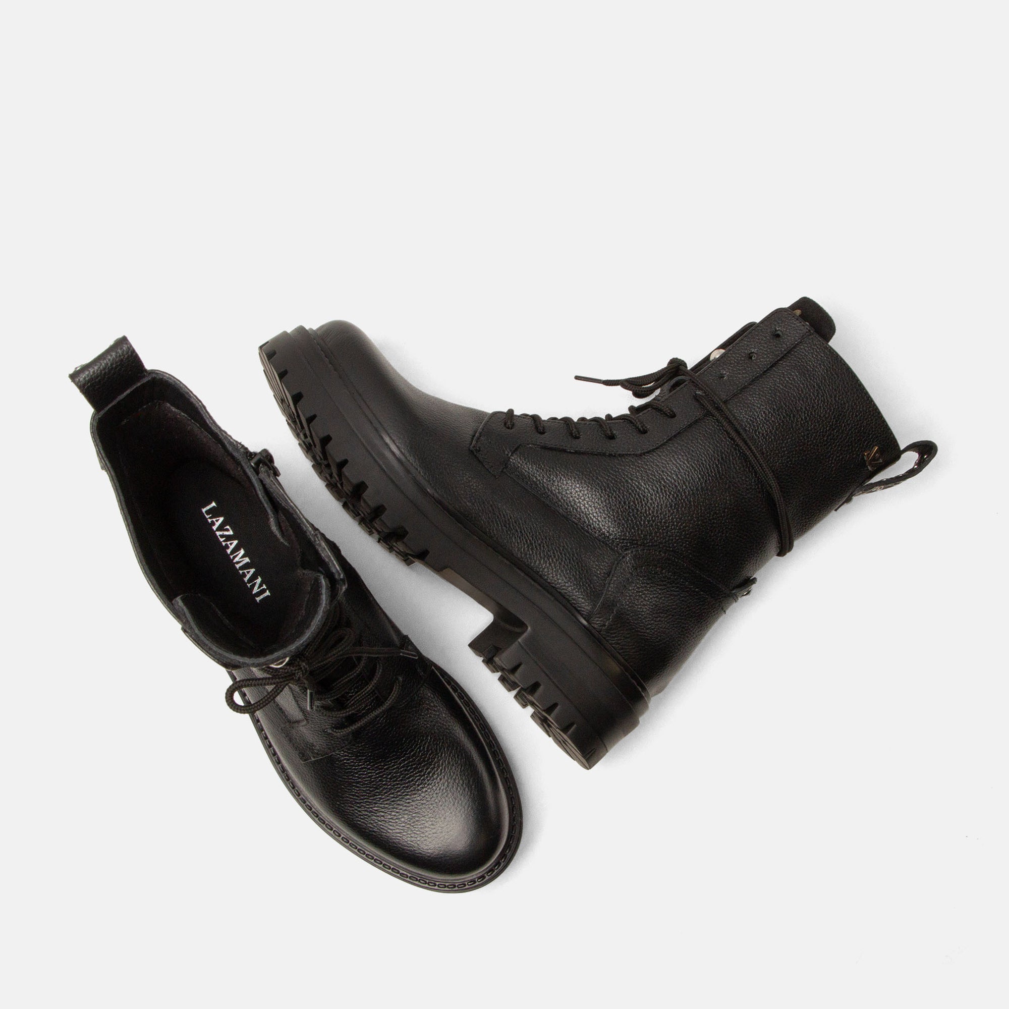 Robust mit einem Hauch Glamour. Diese schwarze Leder-Schnürstiefelette vereint markante Ausstrahlung mit subtilen, femininen Details. Die grobe Profilsohle und das hochwertige Leder sorgen für einen kraftvollen Look, während die funkelnden Nieten entlang der Zunge den typischen Lazamani-Twist verleihen. Perfekt, um jedem Outfit – von Jeans bis Kleid – das gewisse Extra zu geben. Diese hohen Schnürboots mit einer Schafthöhe von ca. 19 cm bringen Power in jeden Schritt – egal bei welchem Wetter.