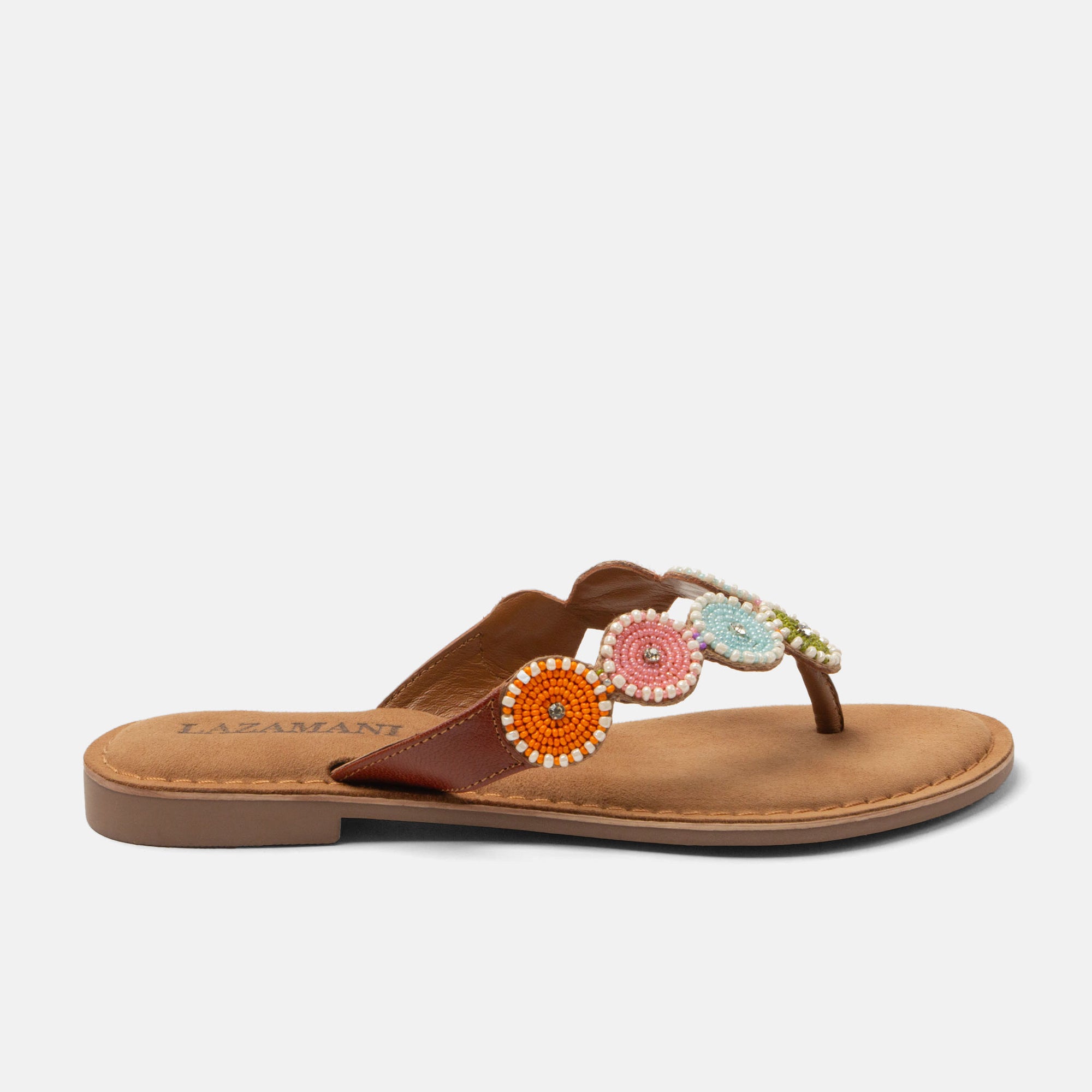 Stil und Komfort kommen in diesen beliebten Lazamani-Zehentrenner perfekt zusammen, die für 2026 ein dezentes, frisches Update erhalten haben. Das Leder-Obermaterial ist reich mit kreisförmigen Mustern aus kleinen Perlen und Strasssteinen verziert. Die harmonisch aufeinander abgestimmten Trendfarben verleihen den Slippern eine stilvolle, sommerliche Ausstrahlung, die sofort Lust auf sonnige Tage oder den nächsten Urlaub macht. Das weich gepolsterte Lazafeel-Fußbett, bezogen mit atmungsaktivem Veloursleder, sorgt selbst an warmen Tagen für optimalen Tragekomfort. Die Gummilaufsohle bietet guten Grip und Stabilität und ist mit einem dezenten Absatz von etwa einem Zentimeter versehen – für eine elegante, leichte Silhouette. Eine perfekte Kombination aus luxuriösen Details und alltagstauglichem Komfort – genau das, was einen echten Lazamani-Favoriten ausmacht.