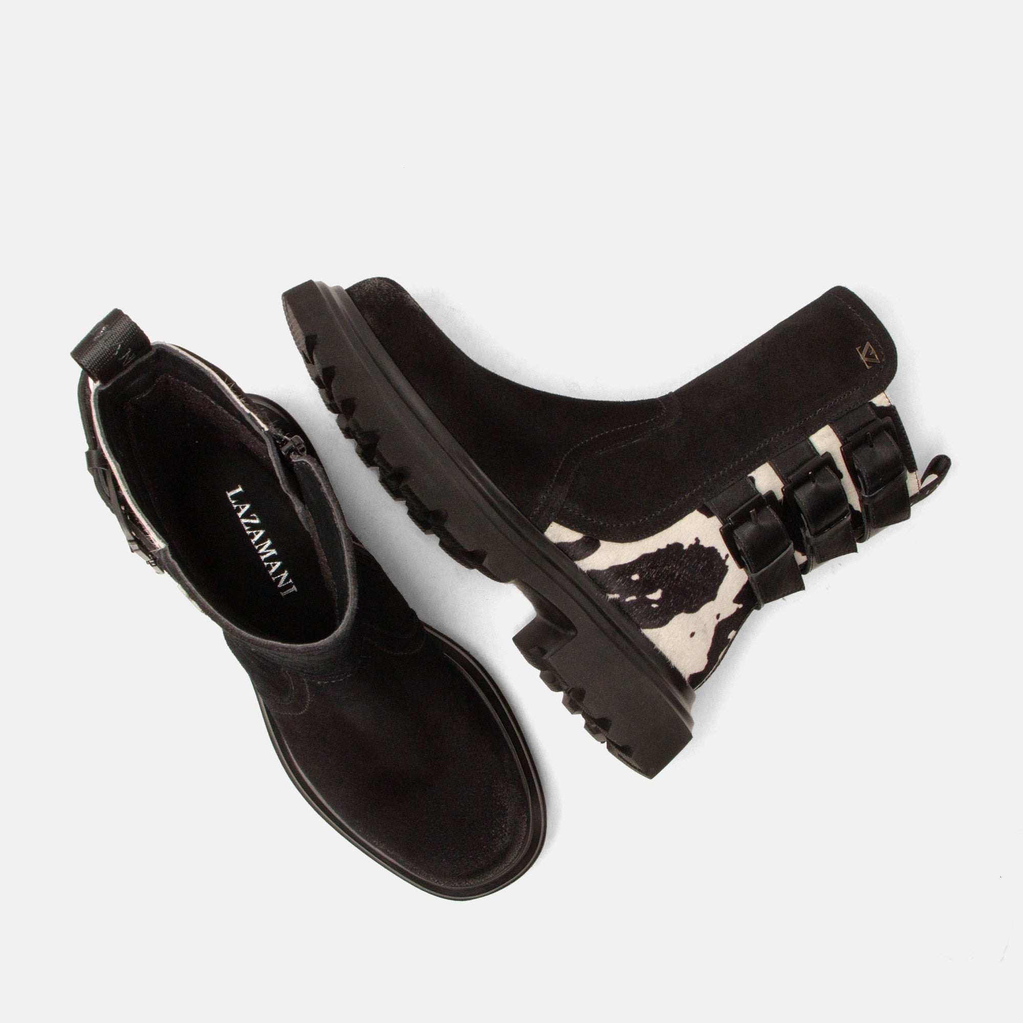 Auffallen erwünscht! Diese markanten Boots von Lazamani sind alles andere als gewöhnlich. Der knöchelhohe Stiefel mit verspieltem Kuhfell-Print zieht garantiert alle Blicke auf sich. Drei Lederriemen mit Schnallen auf der Rückseite sorgen für einen edgy Touch, während das weiche Veloursleder auf der Vorderseite einen femininen Ausgleich schafft. Dank des Reißverschlusses lassen sie sich ganz einfach anziehen. Die chunky Sohle verleiht Charakter, bleibt dabei aber angenehm leicht. Kombiniere sie mit einer Lederleggings oder einem oversized Sweaterkleid – und lass dein Outfit für sich sprechen.