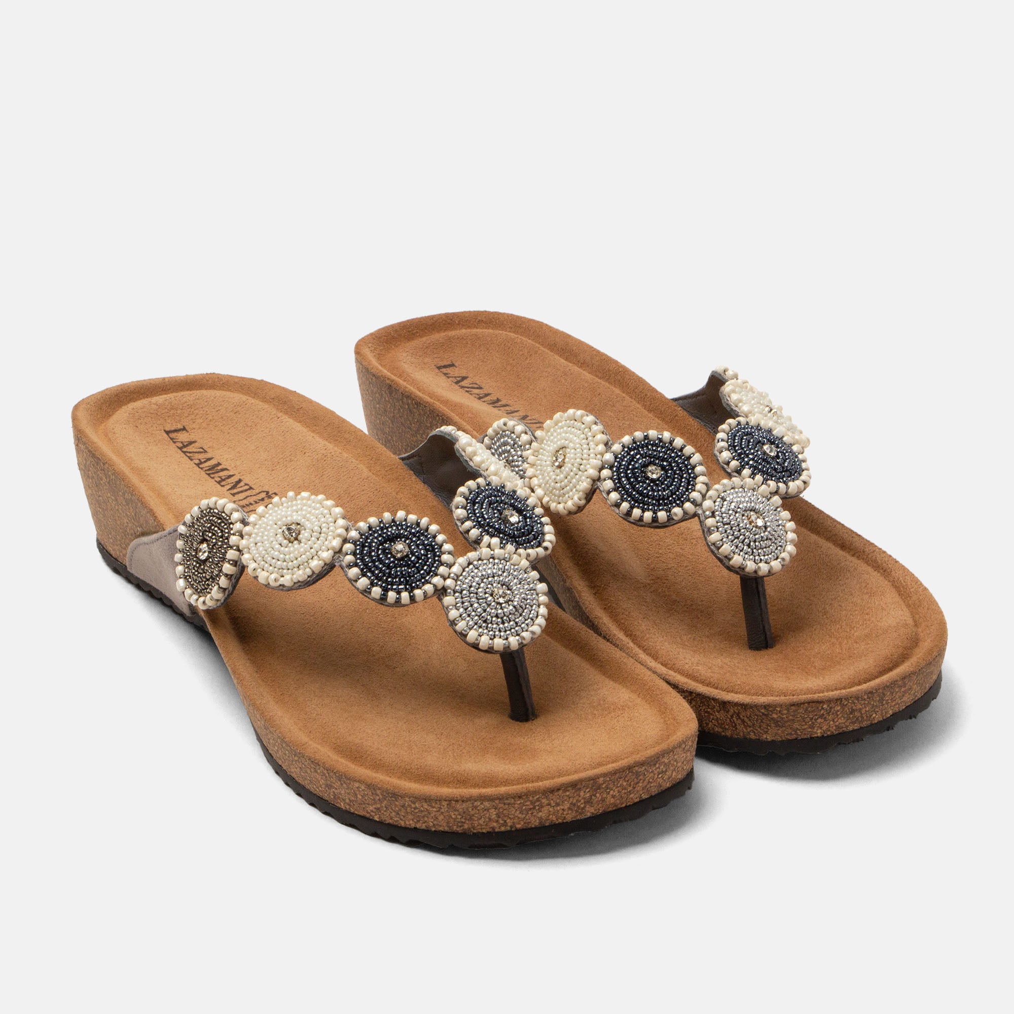 Stil und Komfort gehen bei diesen beigen Slippern mit Keilabsätzen von Lazamani Hand in Hand. Das Obermaterial aus Wildleder dieses trendigen Slippers besteht aus runden Figuren, die aus Strasssteinen und allerlei kleinen Perlen in passenden Farben bestehen. Möchten Sie nicht auch sofort die Koffer packen und die Schuhe anziehen, um sofort zum nächsten Urlaubsziel zu reisen? Damit spazieren Sie stilvoll und bequem entlang des Boulevards oder durch die Stadt. Dafür sorgen das weiche Lazafeel-Fußbett mit atmungsaktivem Wildleder und das Lederfutter. Der 3 cm hohe Keilabsatz verleiht dem Slipper einen extra femininen Touch. Die Zwischensohle besteht aus Kork und eine Gummiaußensohle mit Zickzackprofil sorgt für Grip und Stabilität beim Gehen.